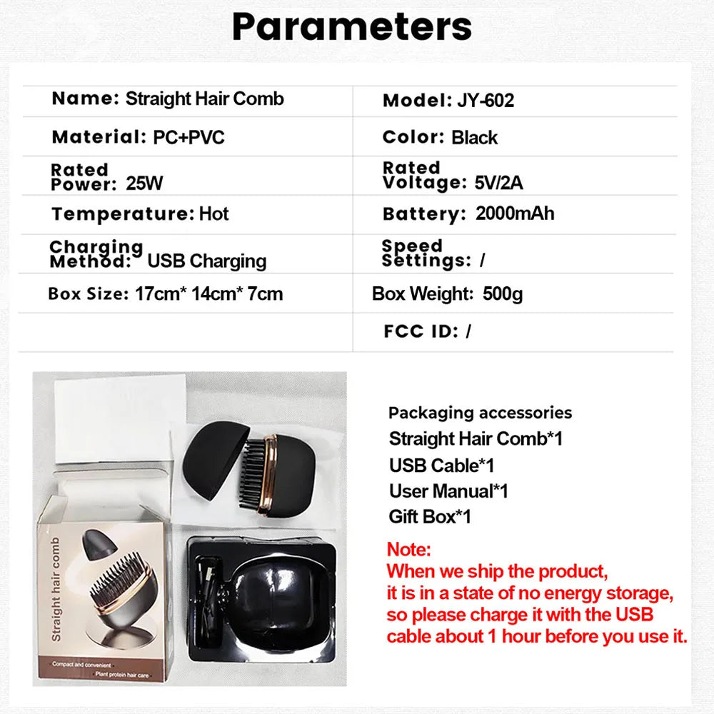Charge the portable USB straightening comb and tame unruly hair in minutes. Get smooth, neat hair before meetings, flights, or gym sessions without carrying bulky tools.